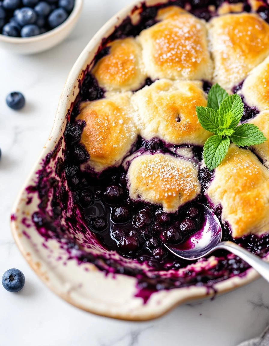 This blueberry cobbler features a juicy, bursting berry filling topped with a golden, crisp crumble. The dish is assembled with fresh blueberries mixed with sugar and lemon juice, then topped with a buttery flour mixture before baking until bubbling and beautifully browned. The final result is a warm, inviting dessert with a soft, jammy center contrasted by a crunchy topping.