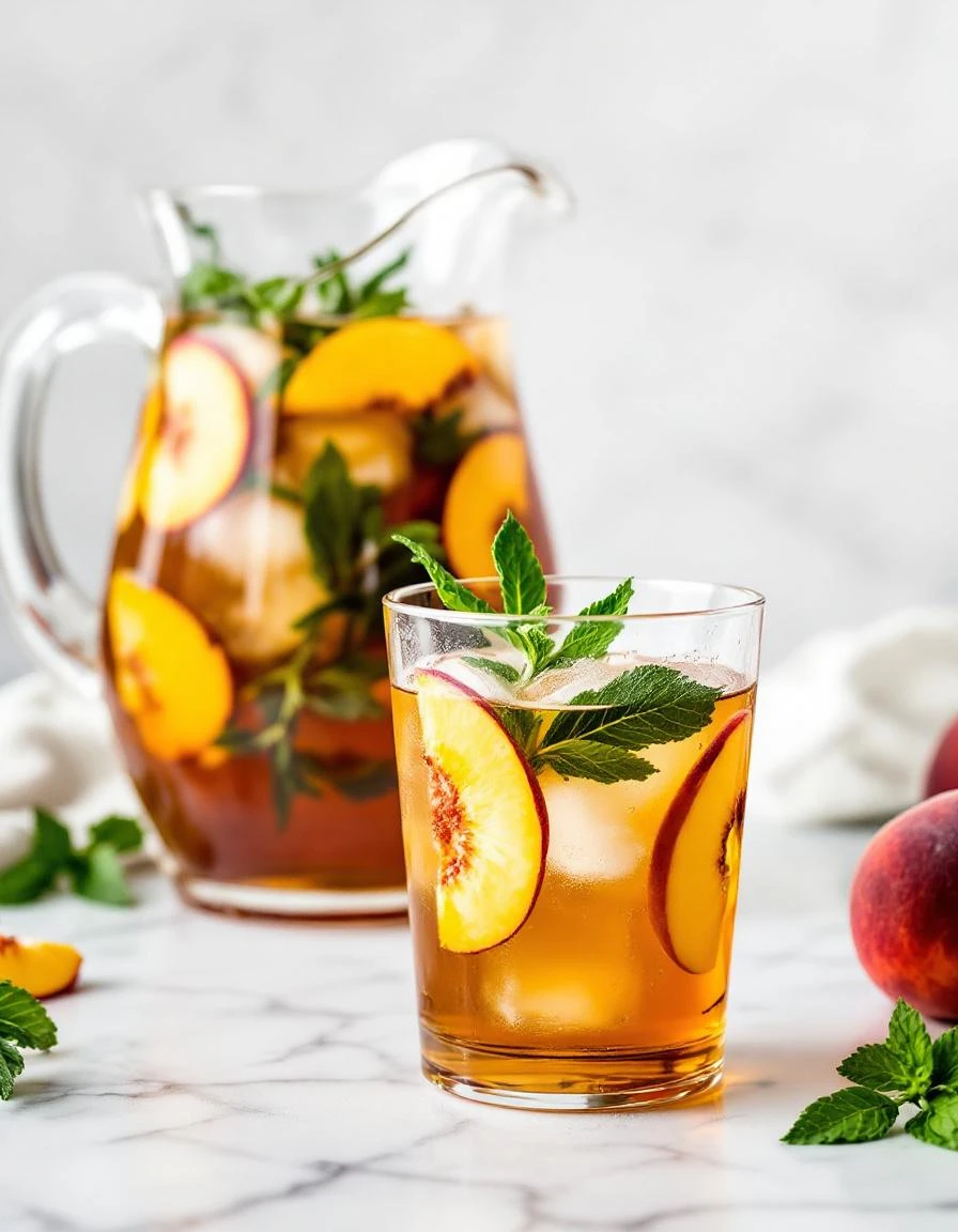- Place the peeled peaches into the pitcher with the tea-bourbon mixture, gently sinking them so they soak up the liquid. Add a squeeze of lemon juice for brightness.