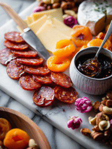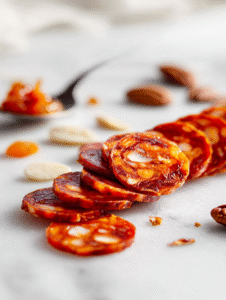 - Lay the thin slices of spicy chorizo in a fan or spiral shape, adding a smoky, spicy element that contrasts with sweeter ingredients.