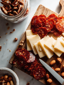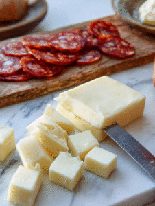 - Slice the smoked gouda into cubes or wedges, arranging them near the chorizo for a smoky, creamy bite.