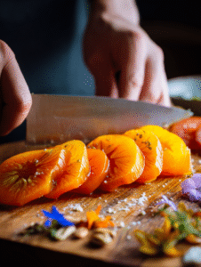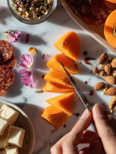 - Thinly slice the pickled persimmons and fan them out across the board, adding bright color and tartness.