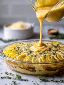 - Pour the cheese sauce evenly over the layered potatoes, making sure all the slices are coated and the sauce seeps into the layers.
