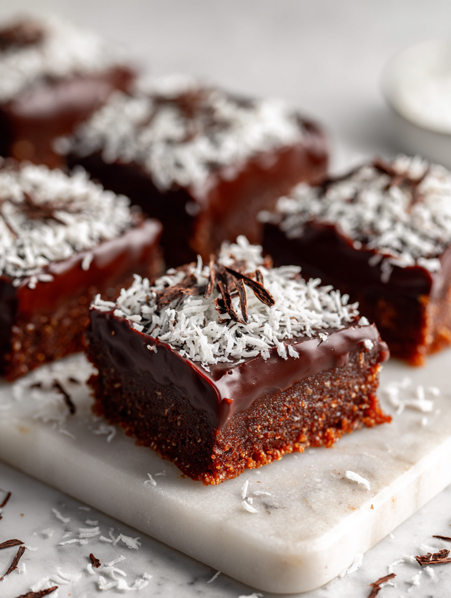 Focusing on how the chewy coconut and silky chocolate layers come together to create a nostalgic treat that feels both comforting and indulgent, with a twist of unexpected crunch from toasted coconut flakes.