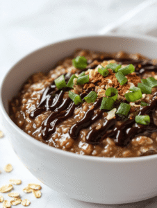 - Spoon the oatmeal into a bowl, optionally garnish with toppings such as sliced almonds, a drizzle of honey, or fresh fruit for visual contrast. Serve hot and enjoy the rich, umami-enhanced flavor.