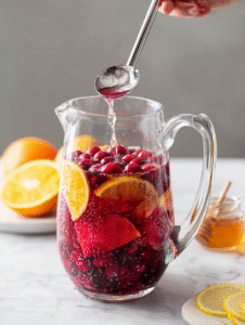 - Fill glasses with ice, then ladle the sangria in, ensuring each glass gets plenty of fruit and cranberries for garnish. Serve immediately and enjoy the festive, refreshing sip.