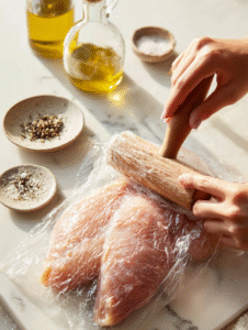 - Place each chicken breast between two sheets of plastic wrap and gently pound with a meat mallet or rolling pin until about 1.5 cm thick. This ensures even cooking and a tender bite.