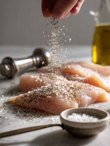 - Sprinkle the cracked black pepper generously over both sides of the flattened chicken breasts, pressing lightly to help it adhere. Add a pinch of sea salt for flavor.