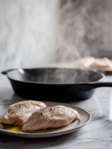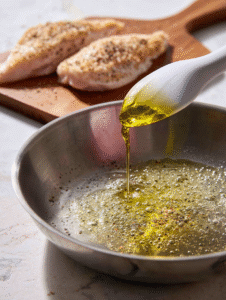 - Add the olive oil to the hot skillet, swirling to coat the surface evenly. You should hear a gentle sizzle when the chicken hits the pan.