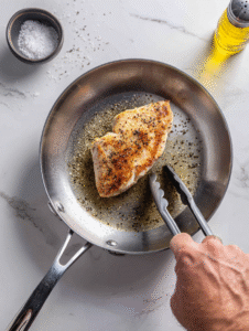 Step 4: Add a splash of olive oil, then sear the chicken for about 3-4 minutes per side, until golden and crusty.