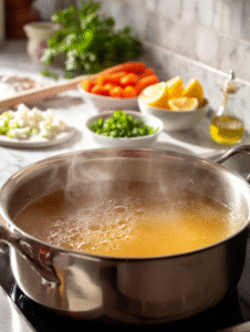 - Add chopped carrots, celery, and diced onion to the simmering broth. Stir gently with a wooden spoon and cook for about 10 minutes until the vegetables are tender but still hold their shape, and the broth begins to develop a richer aroma.