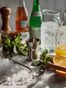 - Gather all ingredients and tools: measuring jigger, muddler, pitcher, spoon, and ice.