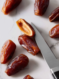 - Use a sharp paring knife to carefully slice each date lengthwise, opening it gently without tearing the fruit. Remove the pit if present.