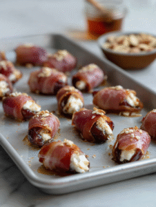- Arrange the prosciutto-wrapped dates on the prepared baking sheet, spacing them evenly.