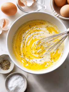 - In a bowl, whisk together the eggs and heavy cream until smooth and slightly frothy, about 30 seconds. Season with salt and pepper.