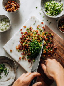 Step 4: Chop your chosen fillings—think smoky bacon bits, fresh herbs, or caramelized onions.