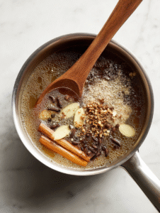Step 3: Add a cinnamon stick, 3 cloves, a pinch of nutmeg, and a small piece of fresh ginger (about 2cm). Bring to a gentle simmer over medium heat, around 70°C (160°F).