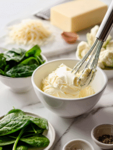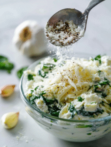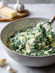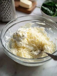 - Add the sautéed spinach and garlic to the cheese mixture, folding gently to incorporate all the flavors evenly.