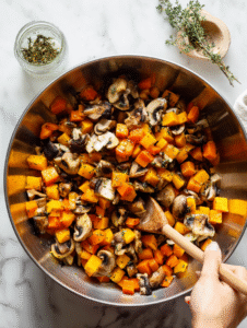 2. In a large mixing bowl, toss the diced butternut squash, sliced mushrooms, and chopped carrots with 2 tablespoons of olive oil, ensuring all pieces are well coated.
